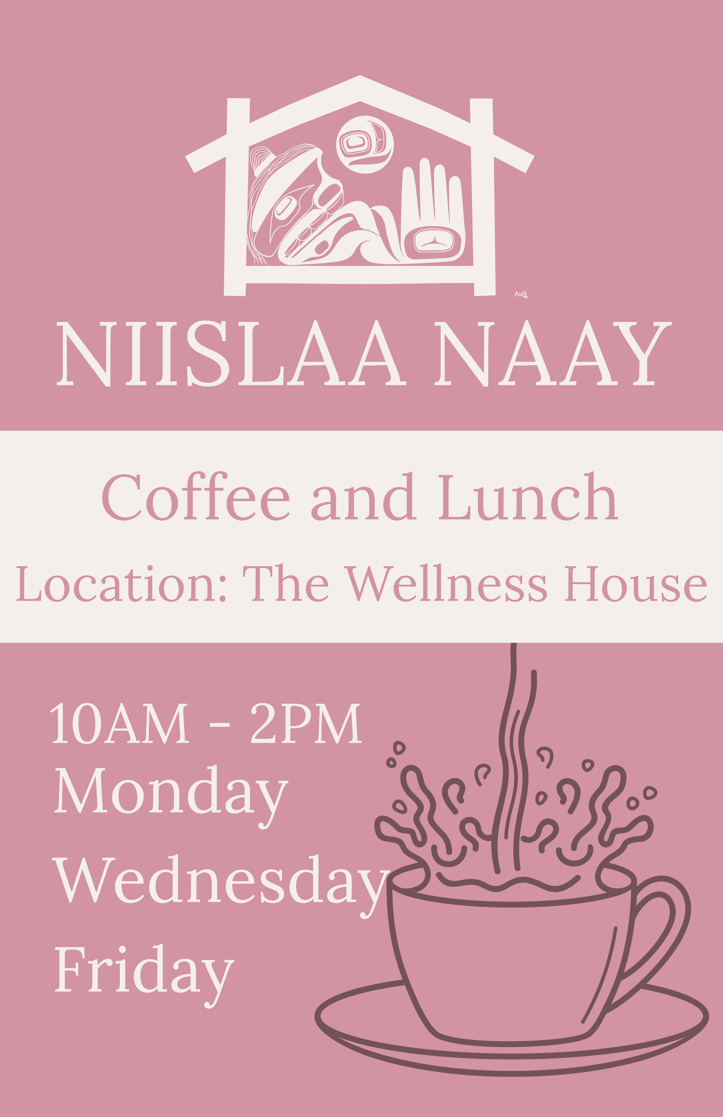 Wellness House Coffee and lunch May 16 Written By Niislaa Naay Join us! at the Wellness House for Coffee and lunchMonday, Wednesday, and Friday10AM - 2PM Niislaa Naay